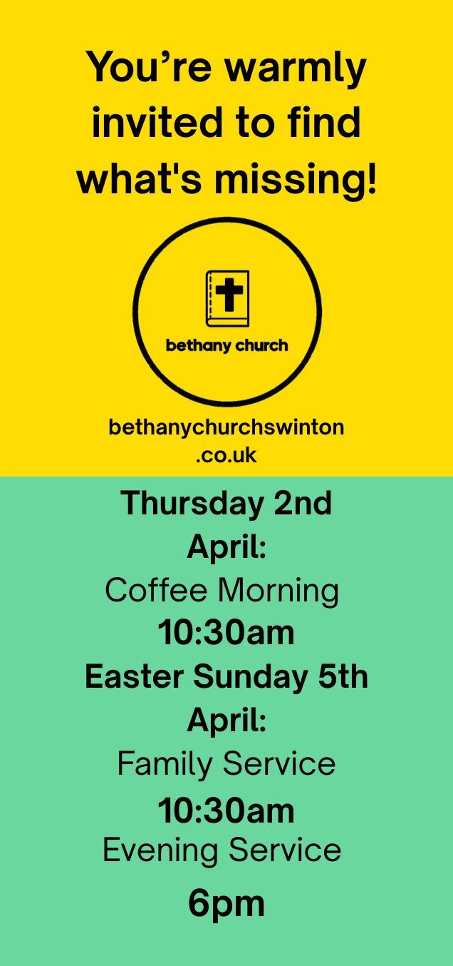 At Bethany Church, we are dedicated to following Jesus, sharing His Gospel, and making disciples in our community and beyond. If you are interested in becoming a Christian and have any questions, please come laong or get in touch. Maybe you are a Christian moving to the area, we'd love to meet you. The people of Swinton, Mexborough and Wath need to hear the good news about Jesus. Come and be part of the team!